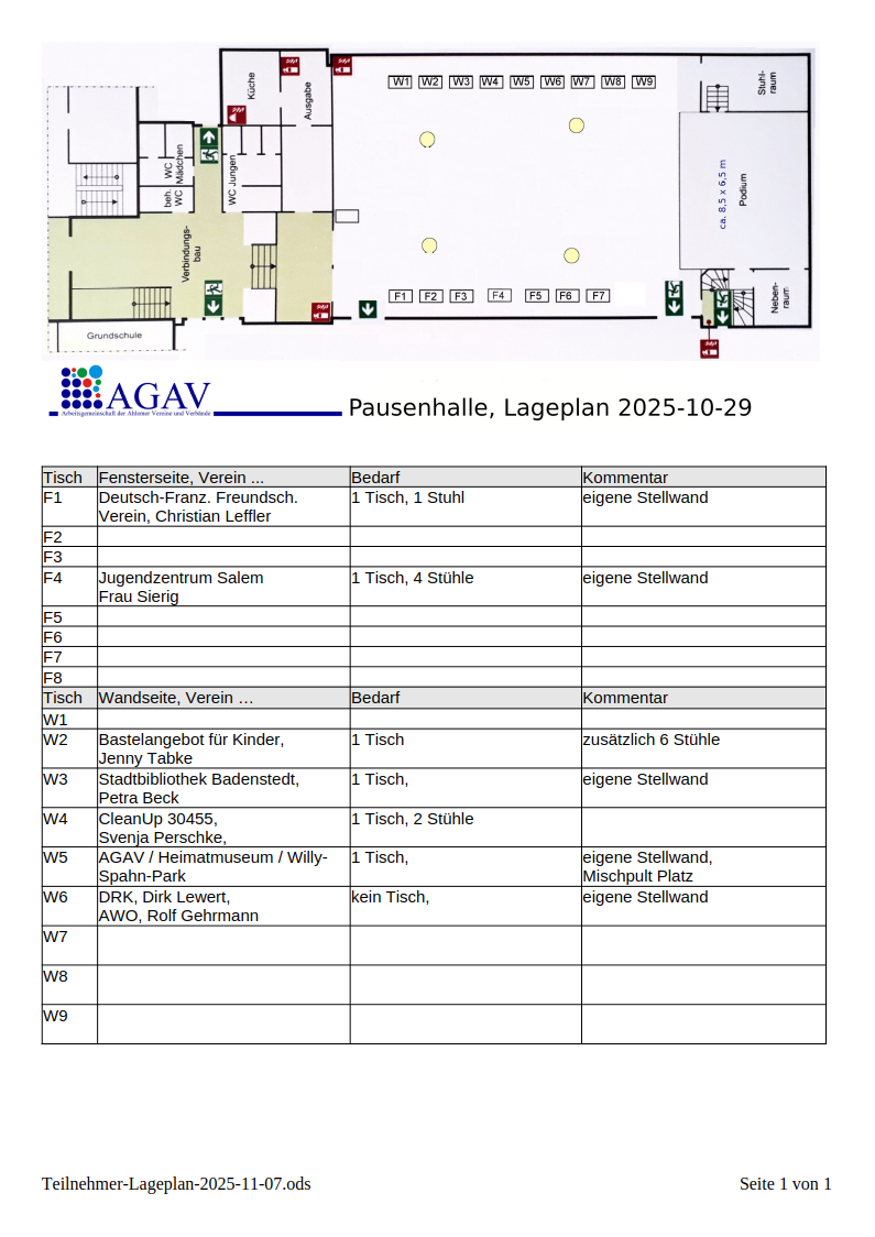 Die Vereine erhalten im Saal ca. 0,9 lfd m Platz für eigene Stellwände oder Korktafeln. Hier der momentane Lageplan zur Abstimmung.