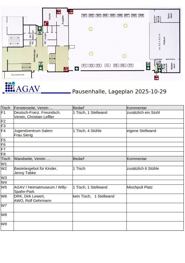 Die Vereine erhalten im Saal ca. 0,9 lfd m Platz für eigene Stellwände oder Korktafeln. Hier der momentane Lageplan zur Abstimmung.